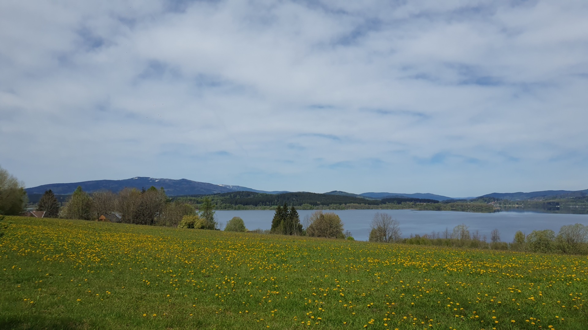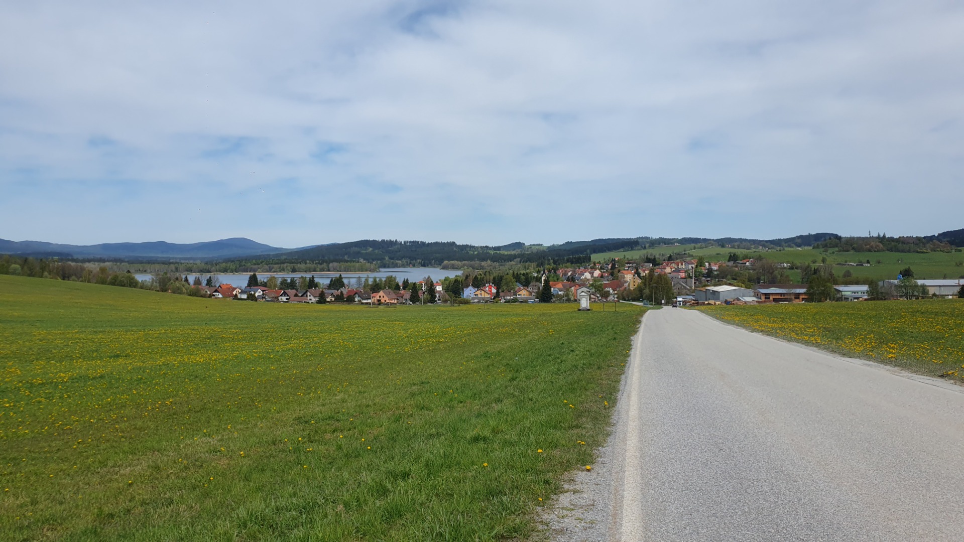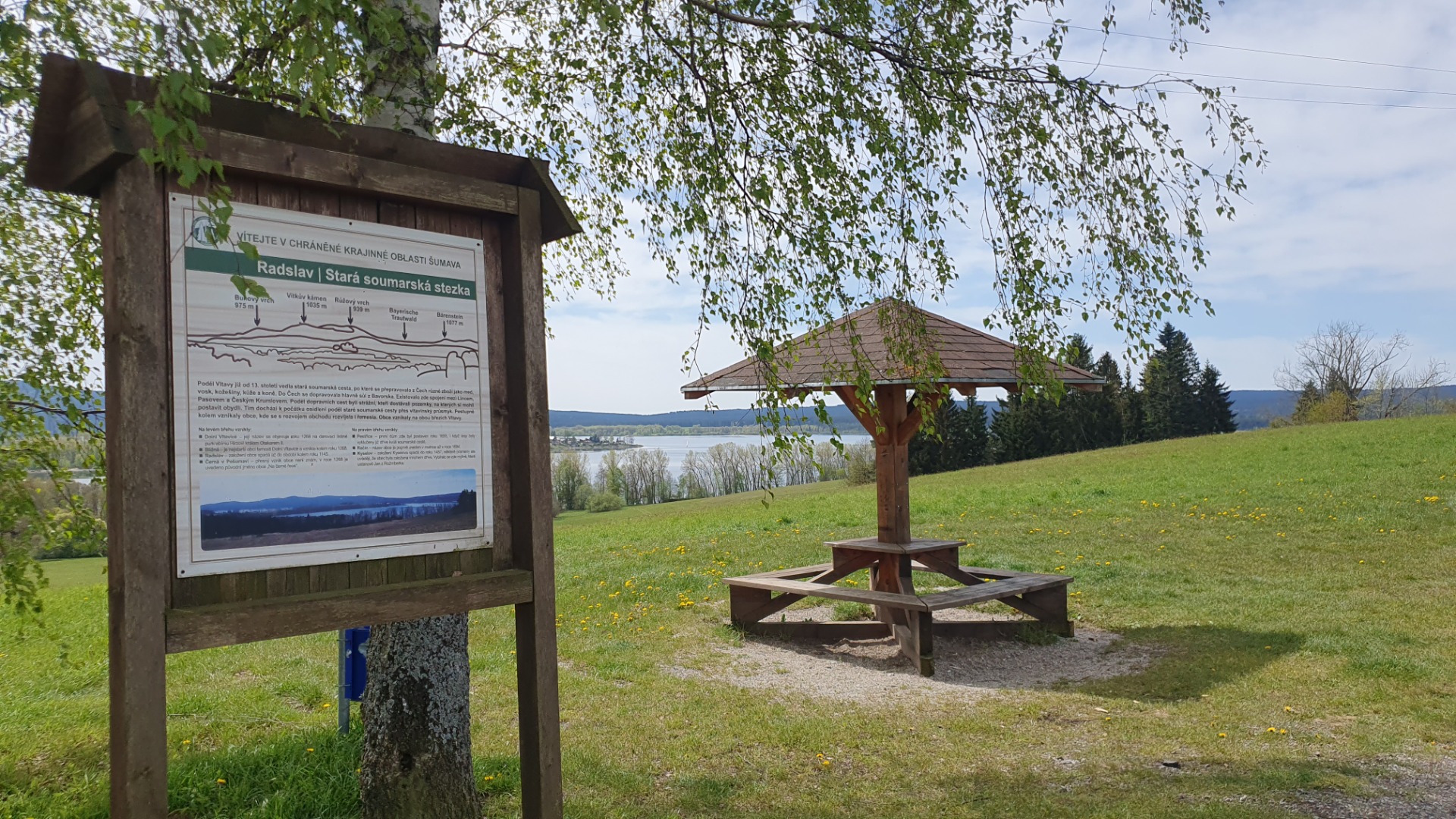 Zde máte dvě možnosti. Můžete dokončit Radslavský okruh a pokračovat po silnici kolem hřbitova a lomu na těžbu kamene přímo do Černé v Pošumaví, jak jsme to šli my. Z kopečku je krásný výhled na Malé Lipno.