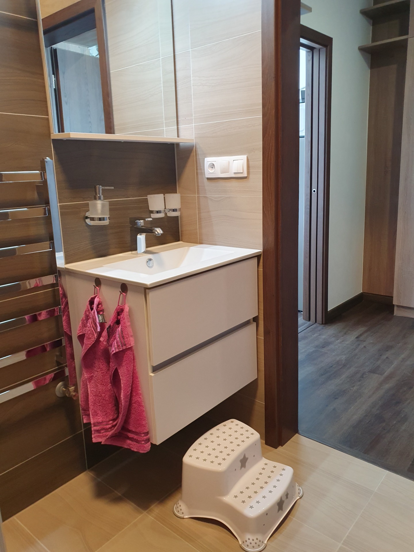 Koupelna je uzpůsobena pro malé děti. Pod umyvadlem najdete stupínek s protiskluzovými nožkami a body na schůdcích. Díky dvěma schůdkům dosáhnou do umyvadla i menší děti. Dále je k dispozici dětské prkýnko na WC.