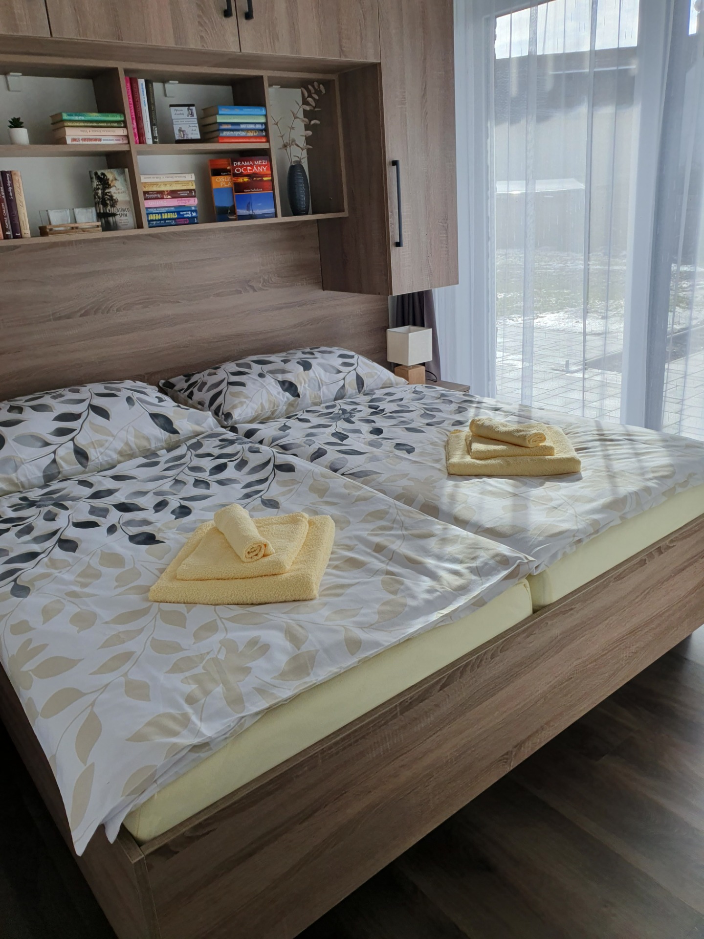 Ložnice disponuje velkou manželskou postelí a vestavnou stěnou se skříněmi a poličkami. Zásuvkové bloky včetně USB nabíječek jsou instalované přímo v nočních stolcích. Naproti posteli je plochá TV. Vedle postele se vejde dětská rozkládací postýlka. Najdete zde kromě dekorací také knihy, které si můžete v rámci pobytu pročítat. K příjemné atmosféře přispívají také dekorace a elektronické svíčky.