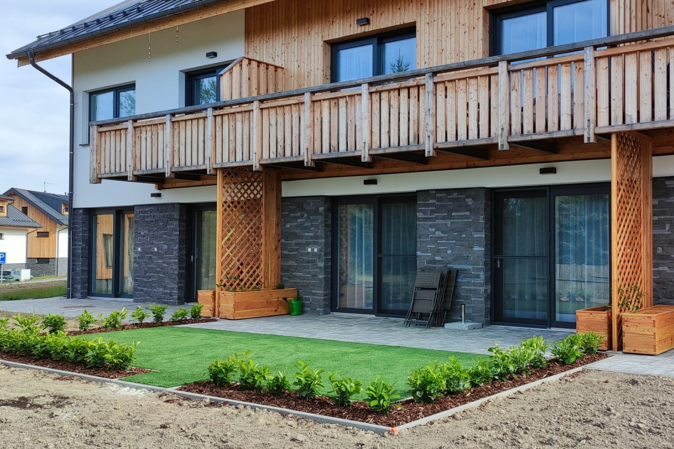 Velikou předností tohoto apartmánu je předzahrádka směřující na jihozápad s částečným výhledem na Malé Lipno.